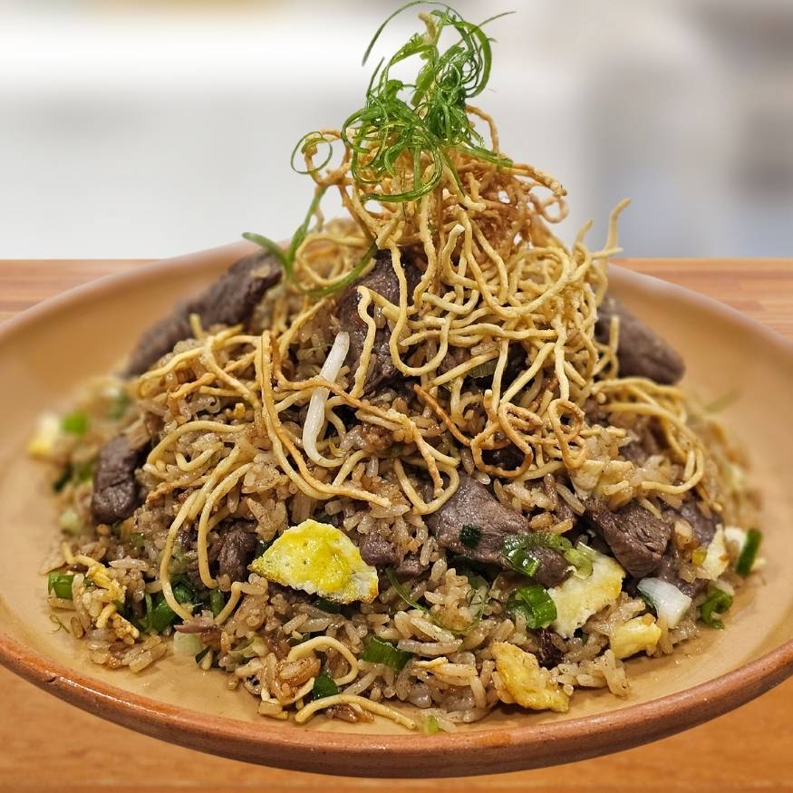 Fideos chinos salteados y arroz con carne en rodajas marinada
