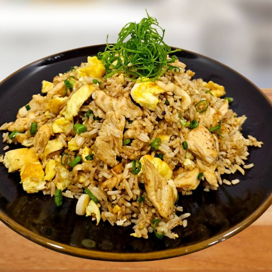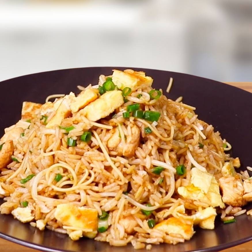 Fideos chinos salteados y arroz con trozos de pollo marinados