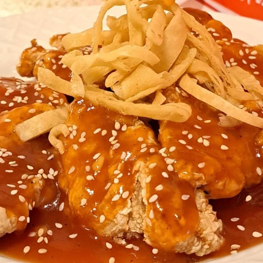 Pollo en trozos crujientes cubierto con salsa de especias chinas