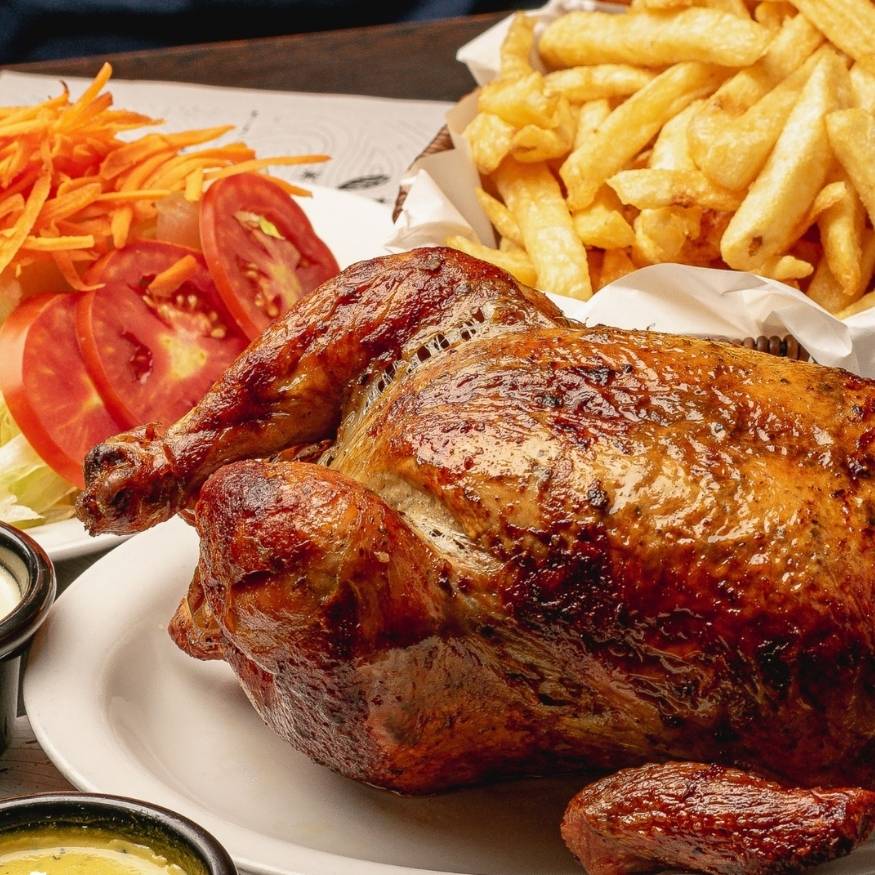 1 pollo asado (carbón) + papas fritas + ensalada fresca