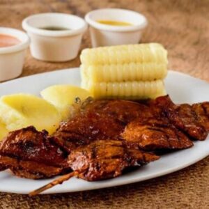 2 palitos de corazón de res marinados en aderezo con chile panca. Se sirve con papas doradas, lechuga, choclo y aderezo.