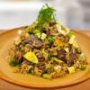 Arroz salteado con carne de res en rodajas marinada con especias y salteada con cebolla china y huevos.