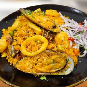 Arroz cocido con salsa madre de mariscos, viene con mejillones, camarones y calamares cocidos. Acompañado de zarsa criolla.
