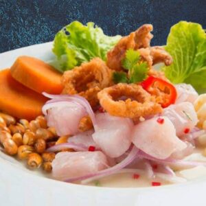 Ceviche Tayta acompañado de aros de calamar fritos.