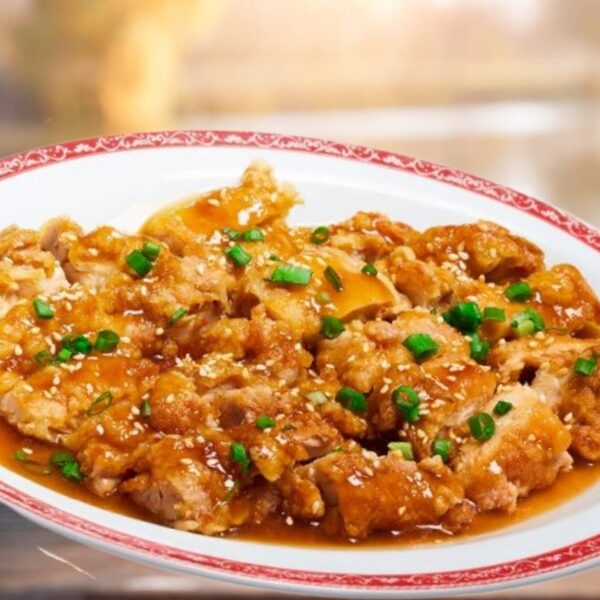 Pollo en trozos crujientes cubierto con salsa de especias chinas y aceite de sésamo.