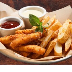 6 tiras de pollo empanizado y frito acompañadas de papas fritas.