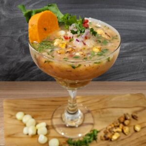Jugo de ceviche Tayta mezclado con cebolla, cilantro y camote acompañado de cancha.
