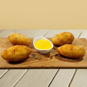 4 piezas de papa rellena que incluye carne molida y huevo acompañadas de salsa huancaína.