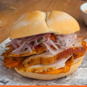 Pan casero relleno de nuestro tradicional Chicharrón de chancho, camote frito y zarsa criolla.