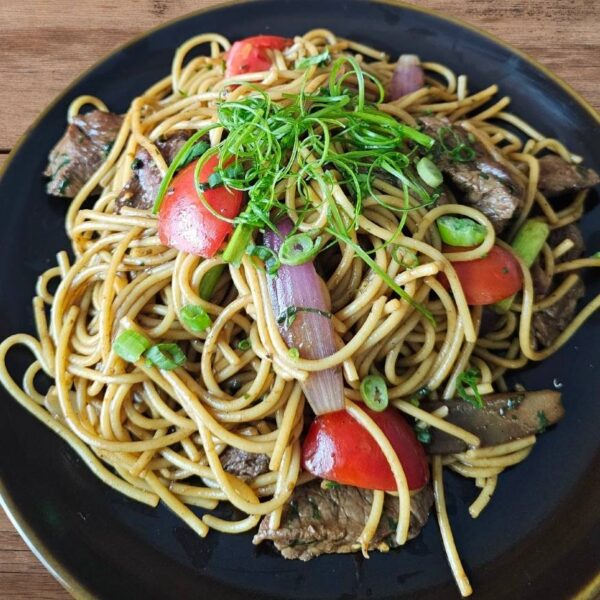 Fideos y carne en rodajas marinados con especias y salteados con cebolla, tomate y cilantro.