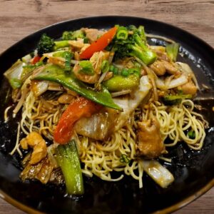 Fideos y pollo en rodajas marinados con especias y salteados con cebolla, tomate y cilantro.