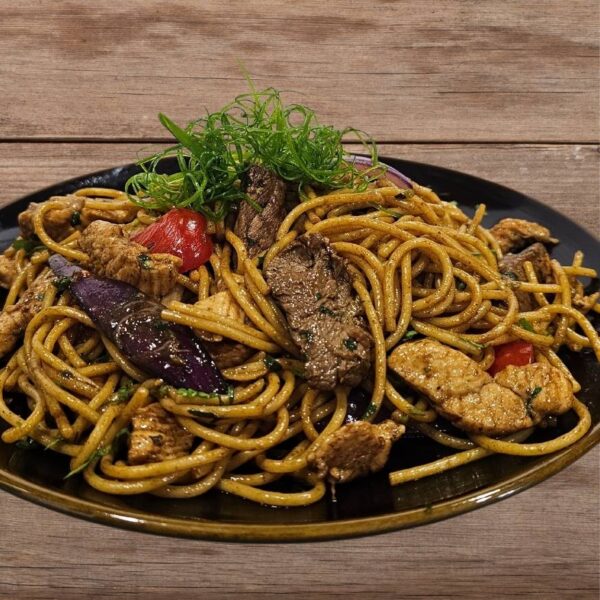 Fideos y rodajas de pollo y carne de res marinados con especias y salteados con cebolla, tomate y cilantro.