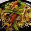 Fideos chinos y pollo en rodajas marinados con especias y salteados con verduras chinas.