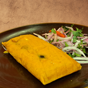 Tamal casero relleno de pollo, huevos y aceitunas peruanas; al vapor en una sabrosa envoltura de hojas de plátano. Viene con sarza criolla.
