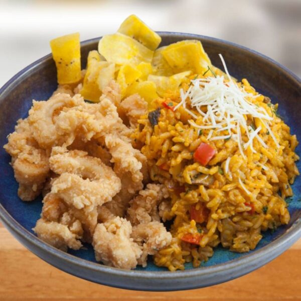 Arroz con Marisco o Arroz Chaufa de Marisco acompañado de pescado frito más yuca frita.