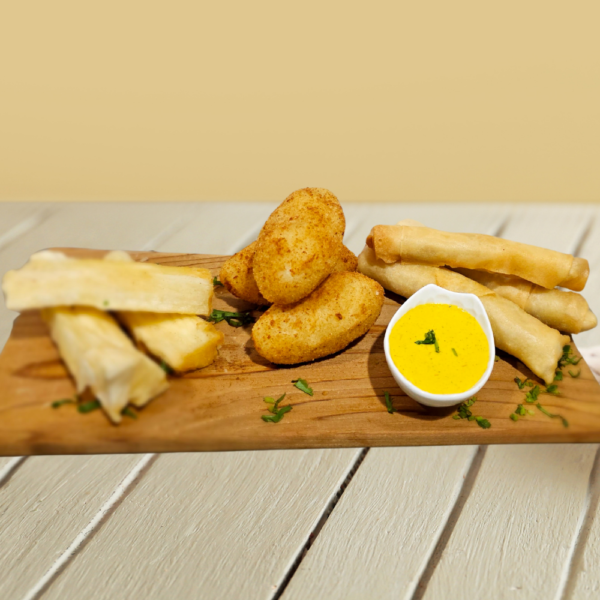 Trío de nuestros antojitos favoritos, 3 papitas rellenas, 3 brasas tequeños y 3 yuquitas. Acompañado de ají pollero, salsa huancaína y ají verde.