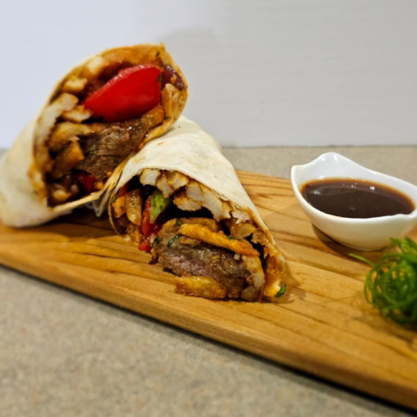 Wrap relleno de Lomo (carne salteada con tomate, cebolla, cilantro y papas fritas).